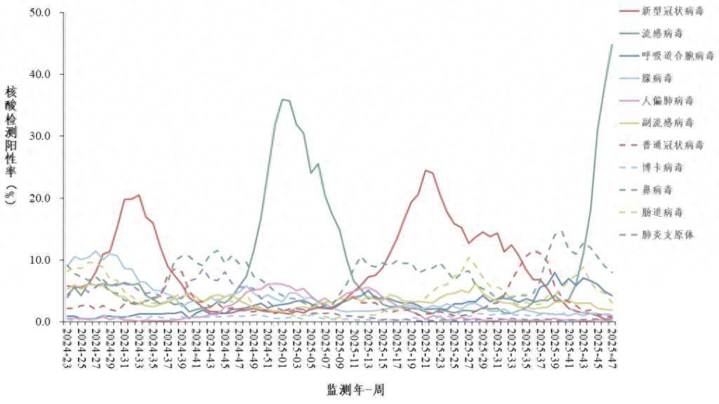 哨点医院门急诊流感样病例呼吸道样本病原体核酸检测阳性率每周变化趋势。《全国急性呼吸道传染病哨点监测情况(2025年第47周)》图