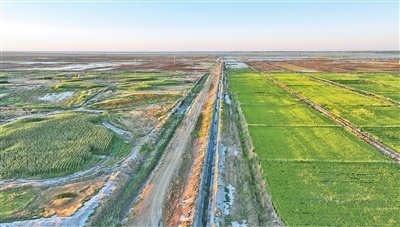吉林省镇赉县种植茭白的盐碱地(右侧)。 潘晟昱摄(人民视觉)