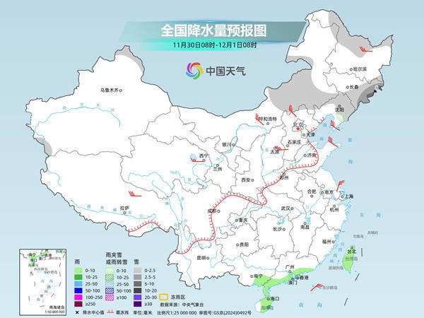 r未来一周,我国总体维持降水稀少的格局,但受冷空气和地面气旋的影响,今天内蒙古东部、东北地区将现降雪天气。具体来看,中央气象台预计,今天,内蒙古东部、黑龙江北部、吉林东部、辽宁北部、新疆北疆北部等地部分地区有小到中雪或雨夹雪,局地有大雪。广西东南部、广东南部、海南岛、台湾岛等地部分地区有小到中雨。